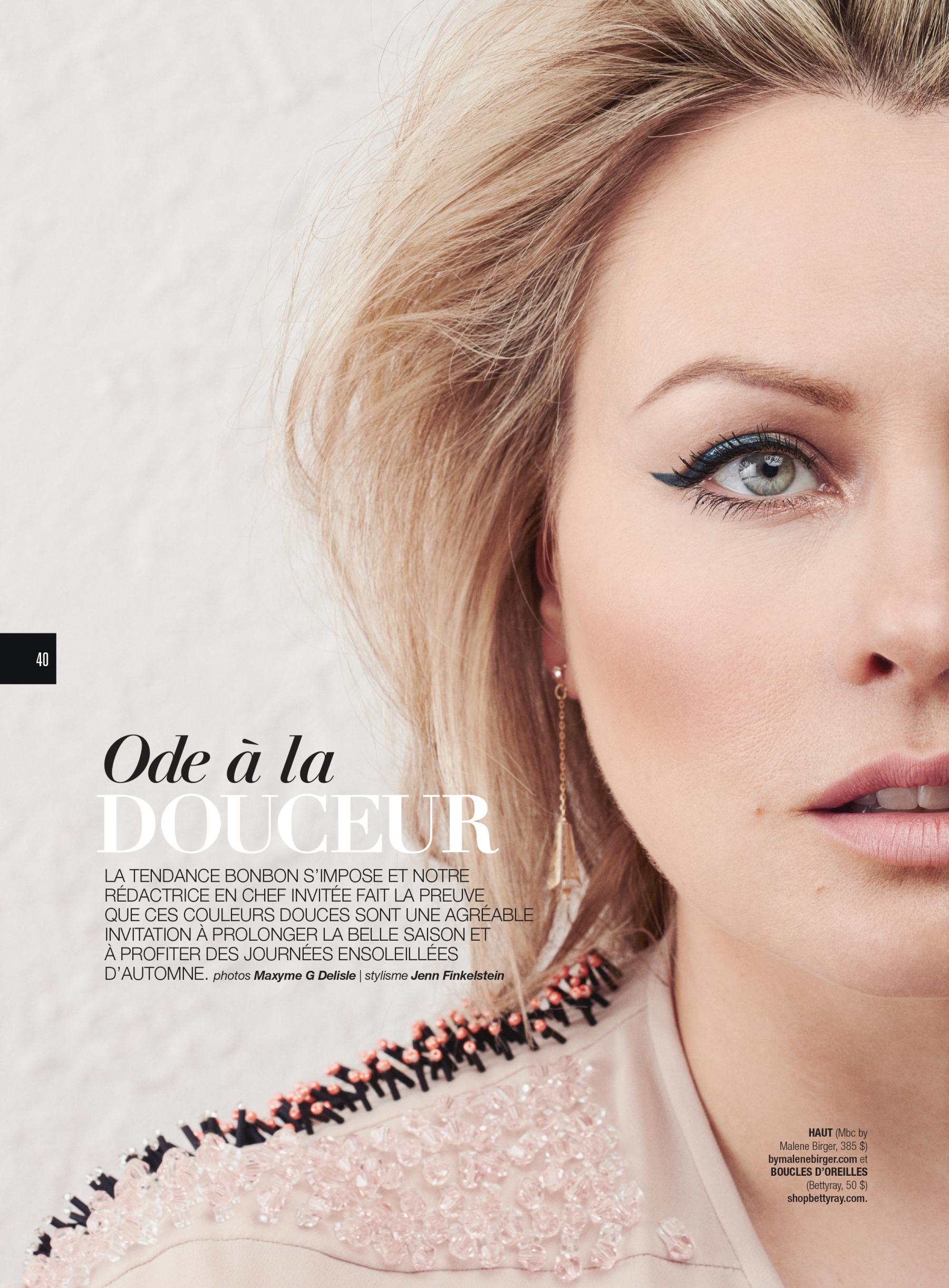 Quelques pages plus loin, vous trouverez une Mitsou toute en douceur habillée de pastels par Jenn Finklestein et photographiée par Maxyme G. Delisle.